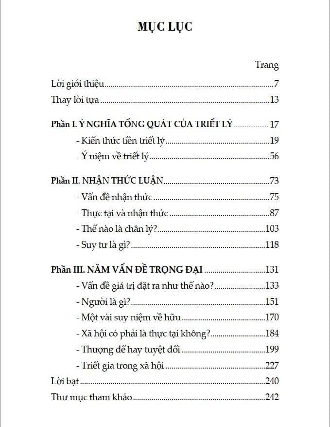 Từ những “kiến thức tiền triết lý” gần gũi với kinh nghiệm thường nhật, tác giả từng bước dẫn người đọc vào các vấn đề nhận thức: ta hiểu thế giới bằng cách nào, chân lý được xác lập ra sao, suy tư nghĩa là gì. Và khi nền tảng ấy được đặt vững, cuốn sách mở rộng sang những câu hỏi lớn hơn về giá trị, con người, xã hội, hữu thể và tuyệt đối - những vấn đề mà bất cứ ai suy nghĩ nghiêm túc về đời sống đều sẽ gặp.