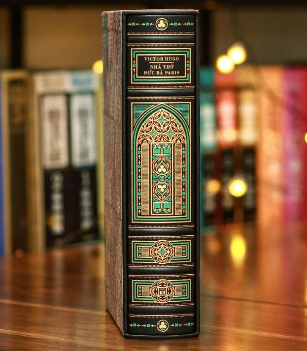 - Loại bìa: Bìa sách được bọc bằng da microfiber màu đen. Hoa văn dập chìm. Tên sách và một số họa tiết ép nhũ 3 màu vàng, cam và xanh ngọc. Mạ cạnh sách bằng nhũ vàng, đóng dấu đỏ của Đông A, có Ex-Libris - dấu sở hữu sách. Sách có hộp đựng bằng carton, hoa văn trang trí in thủy ấn.