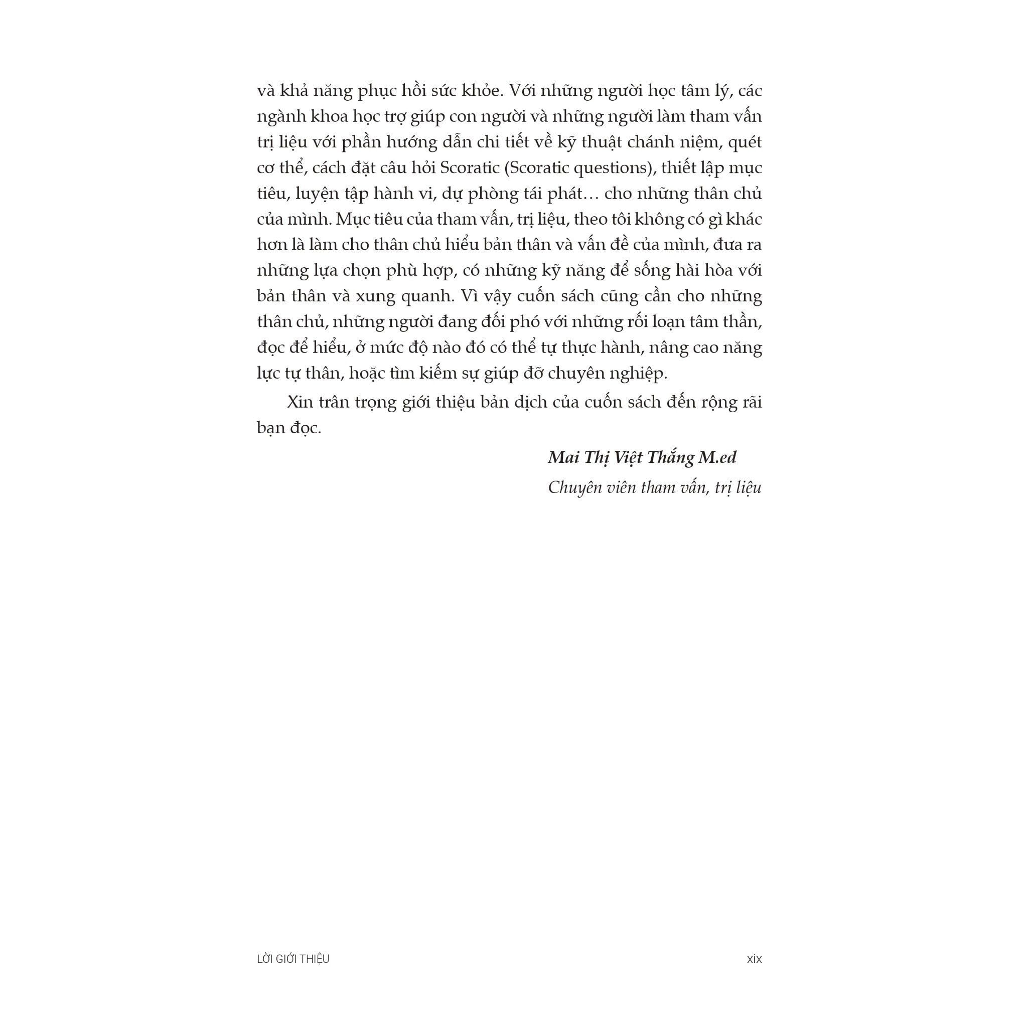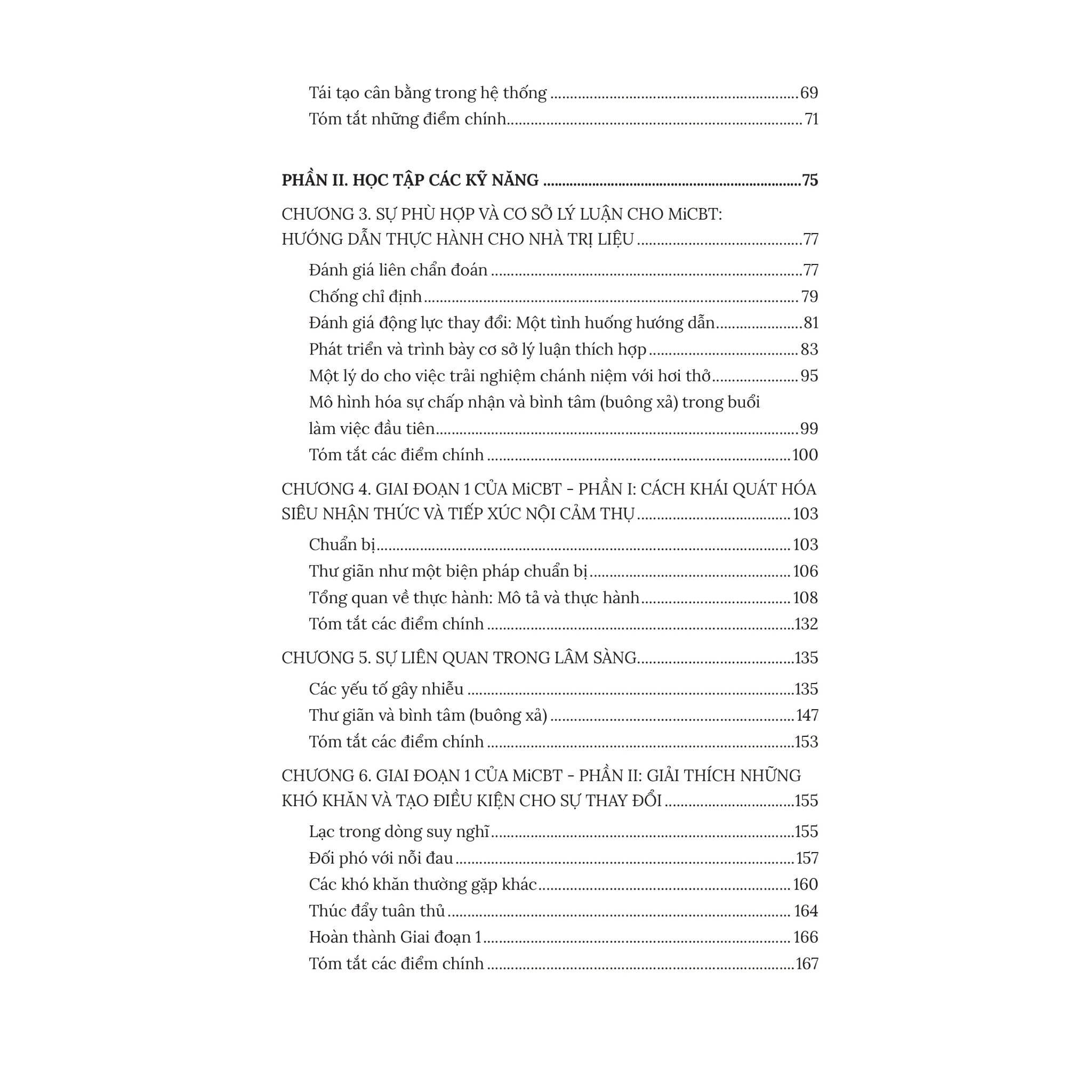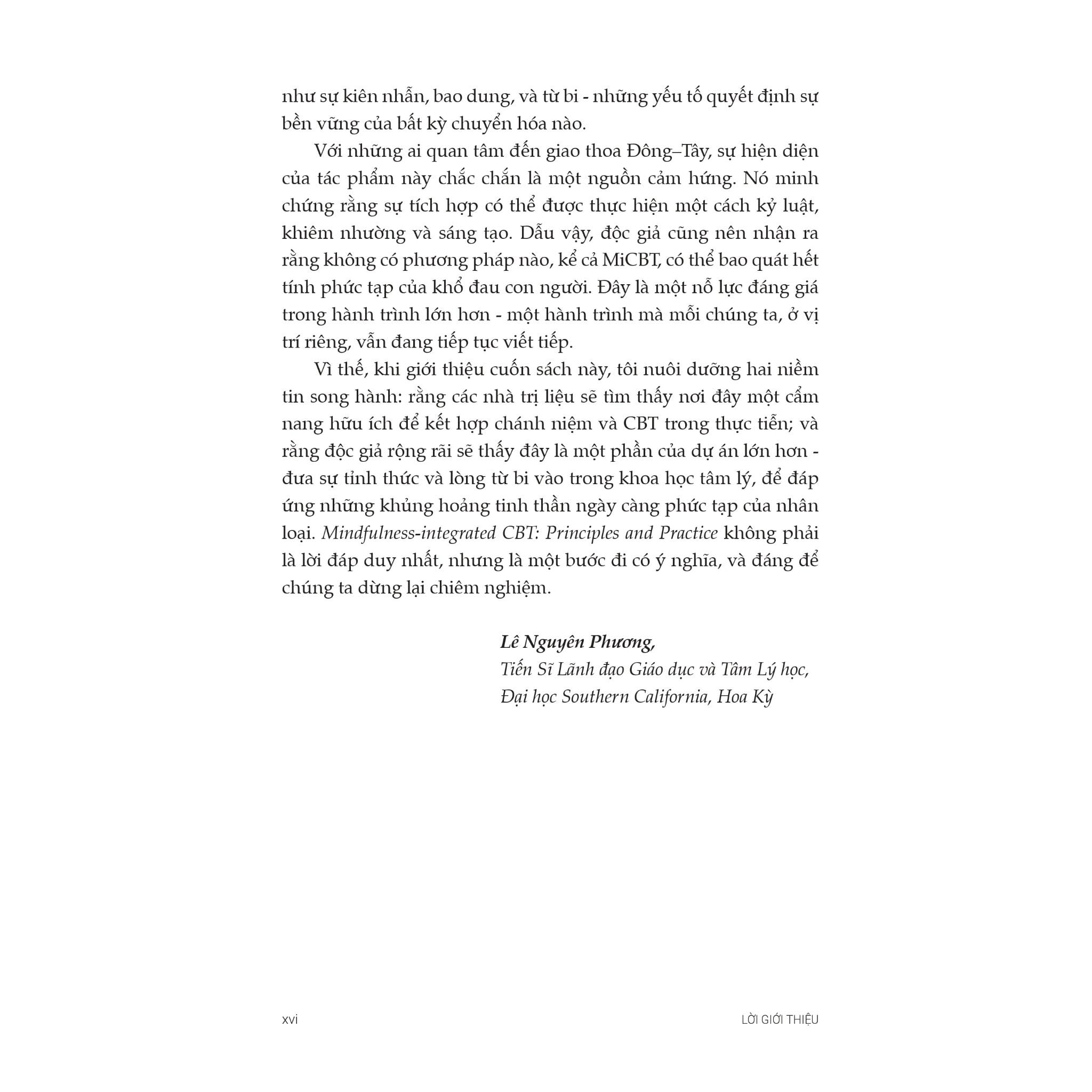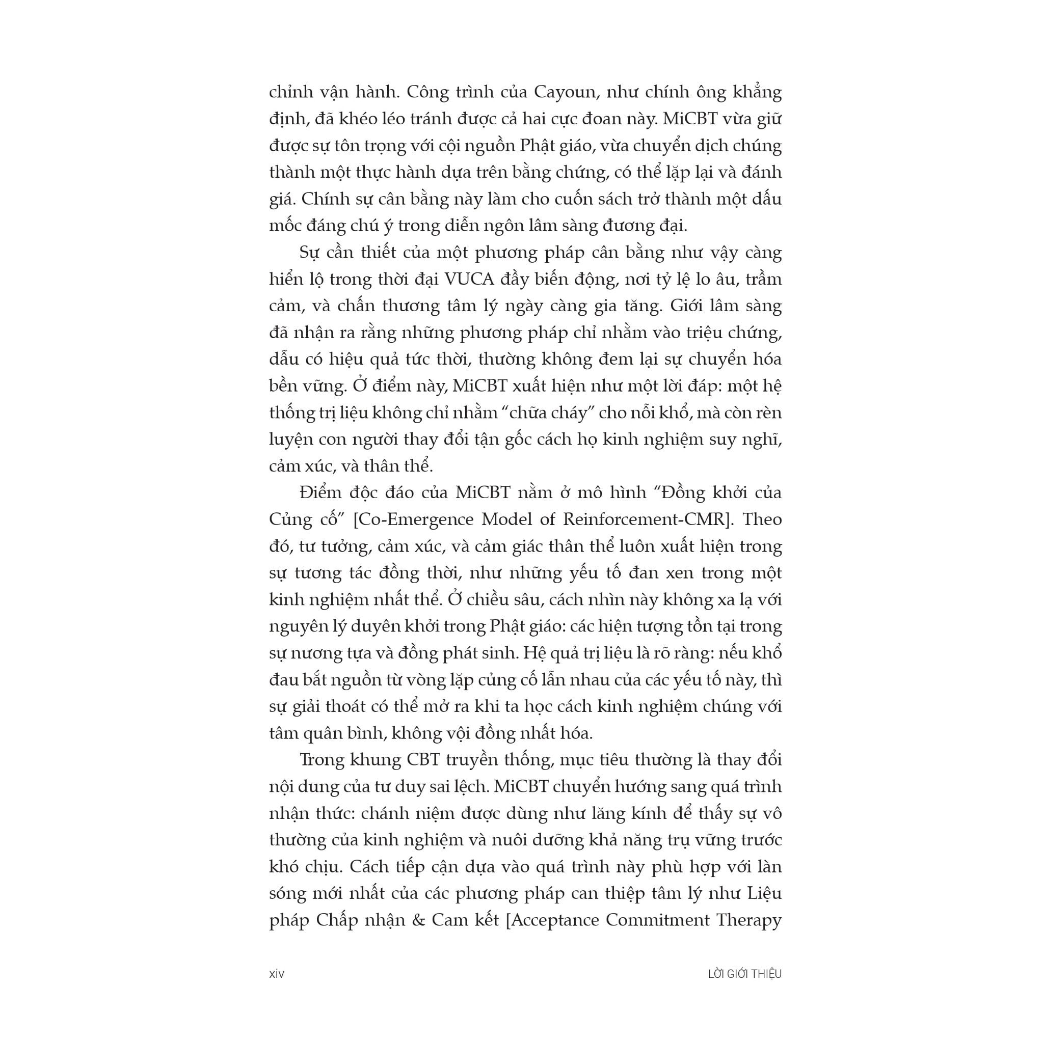 Từ nền tảng đó, cuốn sách Trị liệu Nhận thức Hành vi Tích hợp Chánh niệm: Nguyên tắc và Thực hành ra đời như một hướng dẫn toàn diện cho các nhà trị liệu, giảng viên và cả những người thực hành quan tâm đến MiCBT. Sách không chỉ trình bày lý thuyết một cách rõ ràng mà còn cung cấp hướng dẫn cụ thể từng bước để ứng dụng trong thực tế lâm sàng.